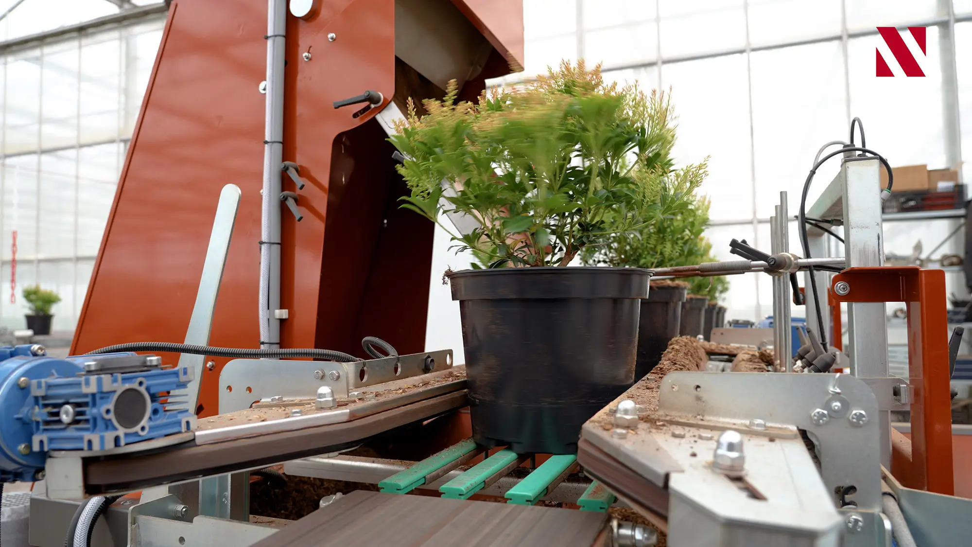 I vasi rotondi vengono fatti ruotare per garantire una distribuzione uniforme del materiale sotto la pianta. Prima dell’uscita dalla macchina, il vaso viene livellato e il materiale in eccesso viene riportato nel contenitore di raccolta, assicurando un ambiente pulito e riducendo i costi del materiale.