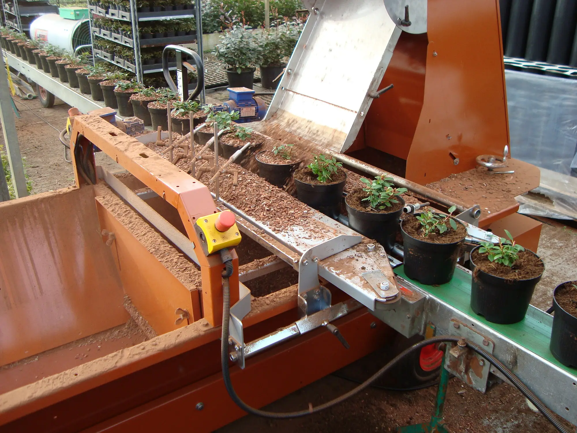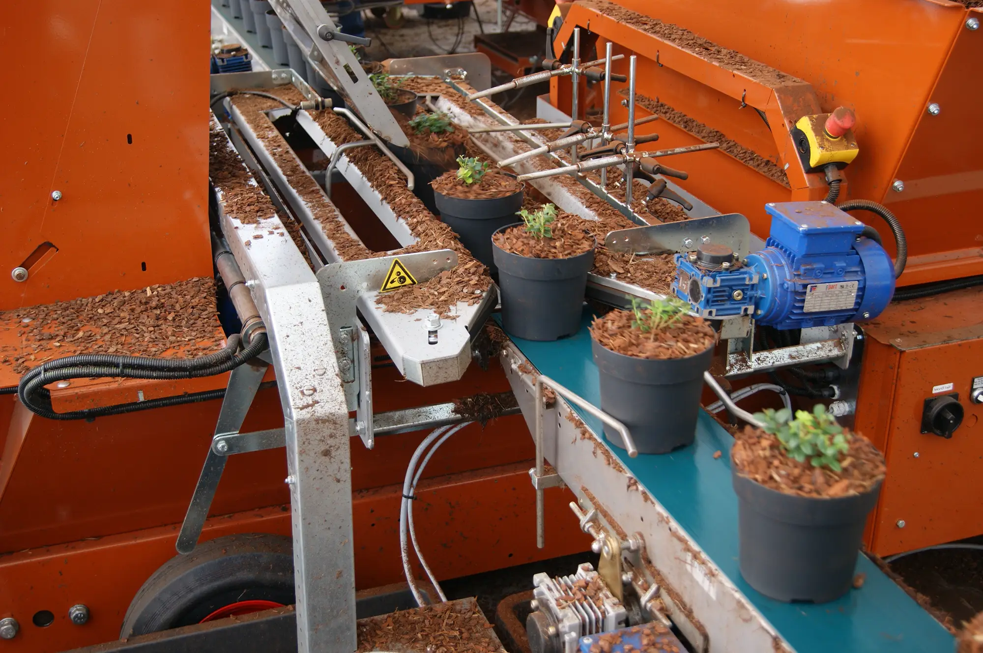 Questa macchina distribuisce uno strato di pacciamatura sulla parte superiore del vaso e sotto la pianta, eliminando erbacce e muschio.